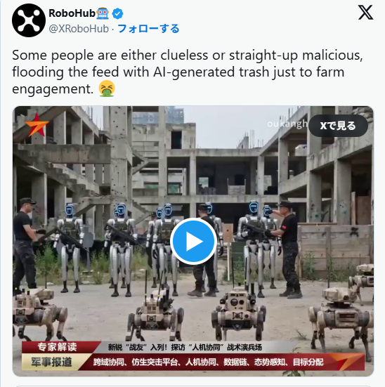 最近、Unitree絡みでこういうAI動画が大量に出回っている。近い将来の話ではあるかもしれないが、これは間違いなくAI生成動画だ。