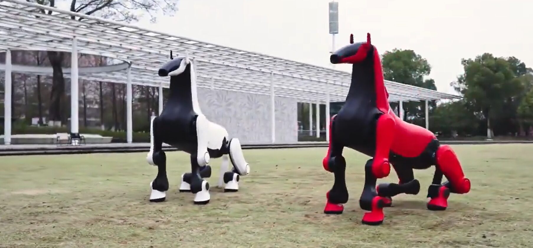 二体の人型ロボットが馬の着ぐるみに入って動いてるみたいだ。